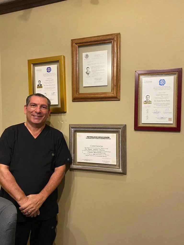 El Dr. Tomás García Farías se encuentra certificado y recertificado por el Consejo Mexicano de Cirugía Plástica, Estética y Reconstructiva A.C, es miembro de la Asociación Mexicana de Cirugía Plástica Estética y Reconstructiva A.C, Miembro de la Federación Iberolatinoamericana de Cirugía Plástica, Miembro Fundador del Colegio de Cirujanos Plásticos de Tamaulipas, de el cual es expresidente.